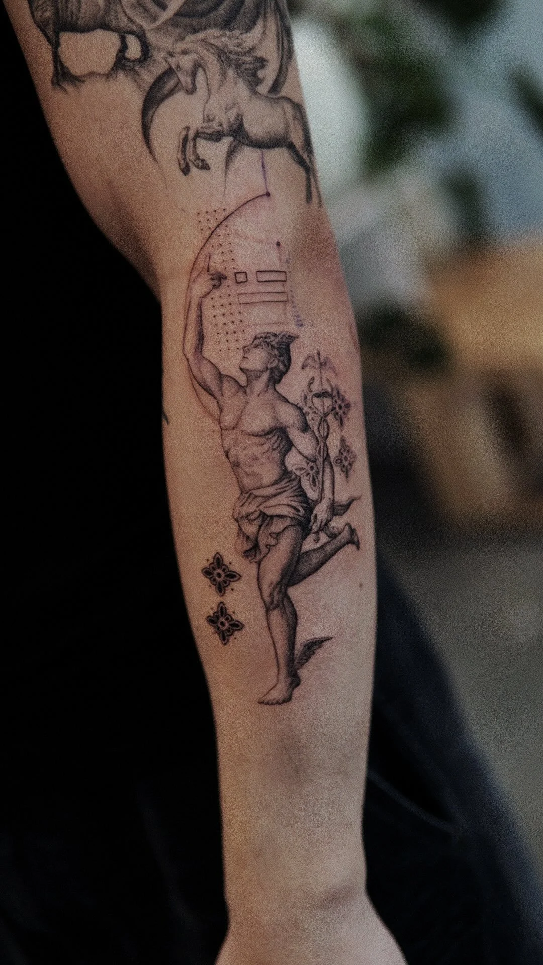 Healed upper arm and newest addition for his sleeve with Hermes and ornamental design.