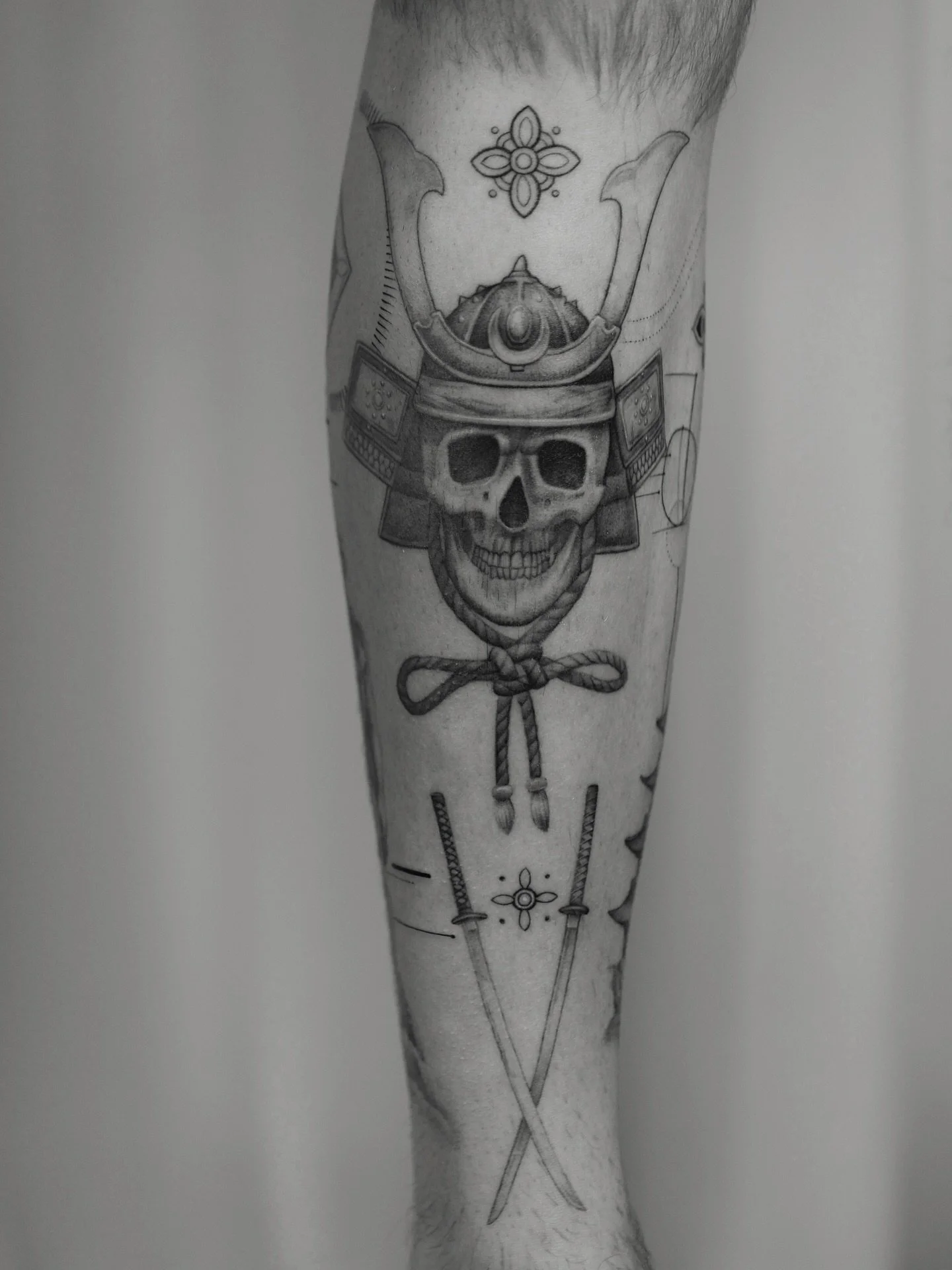 Tied his Korean and Japanese Heritage into this portion of his leg. Storytelling in small details and building on to the design with a fineline background.