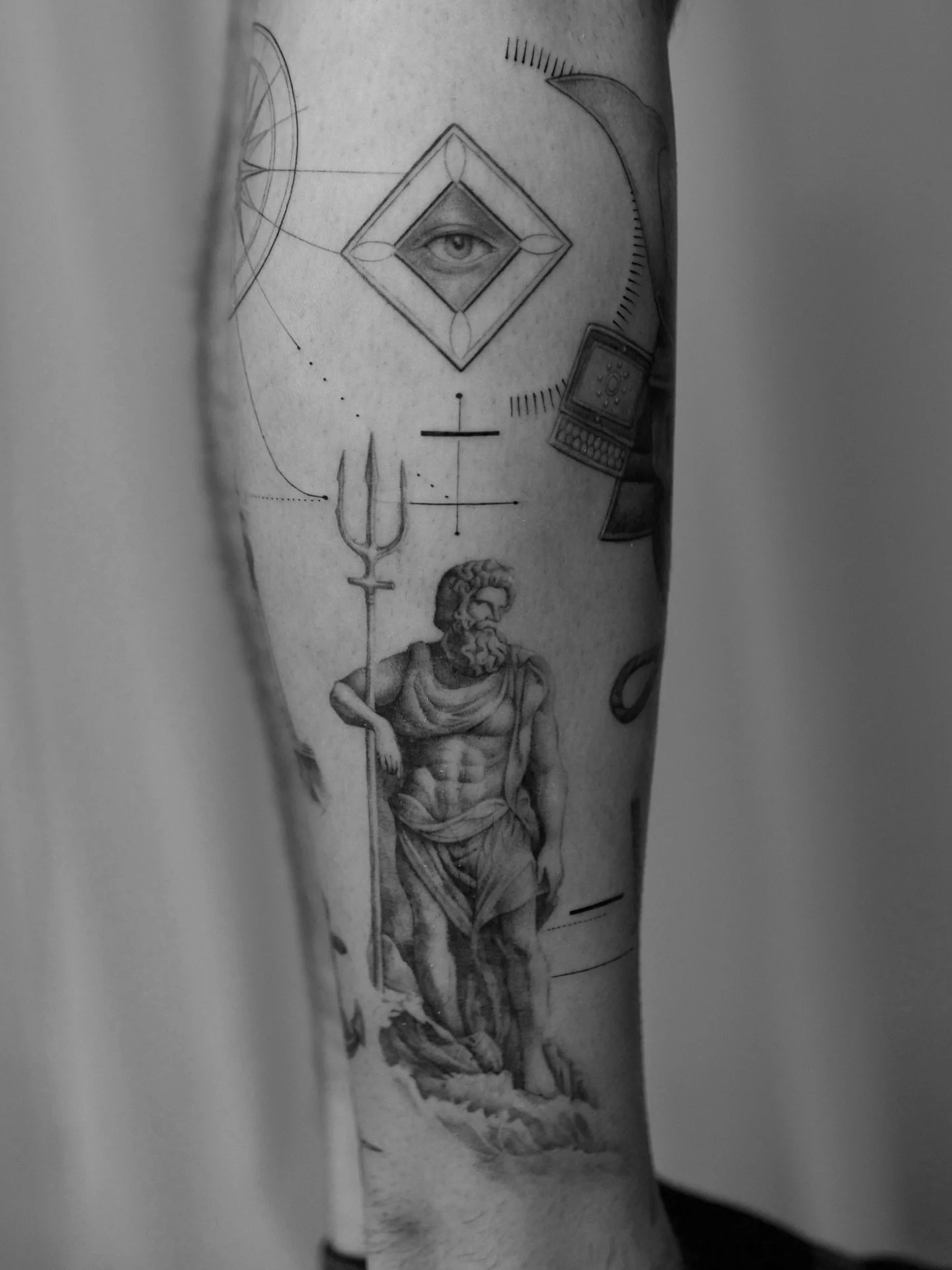 #seattletattoos #finelinetattoo #tattooideas #poseidon #statuetattoo #sculpture