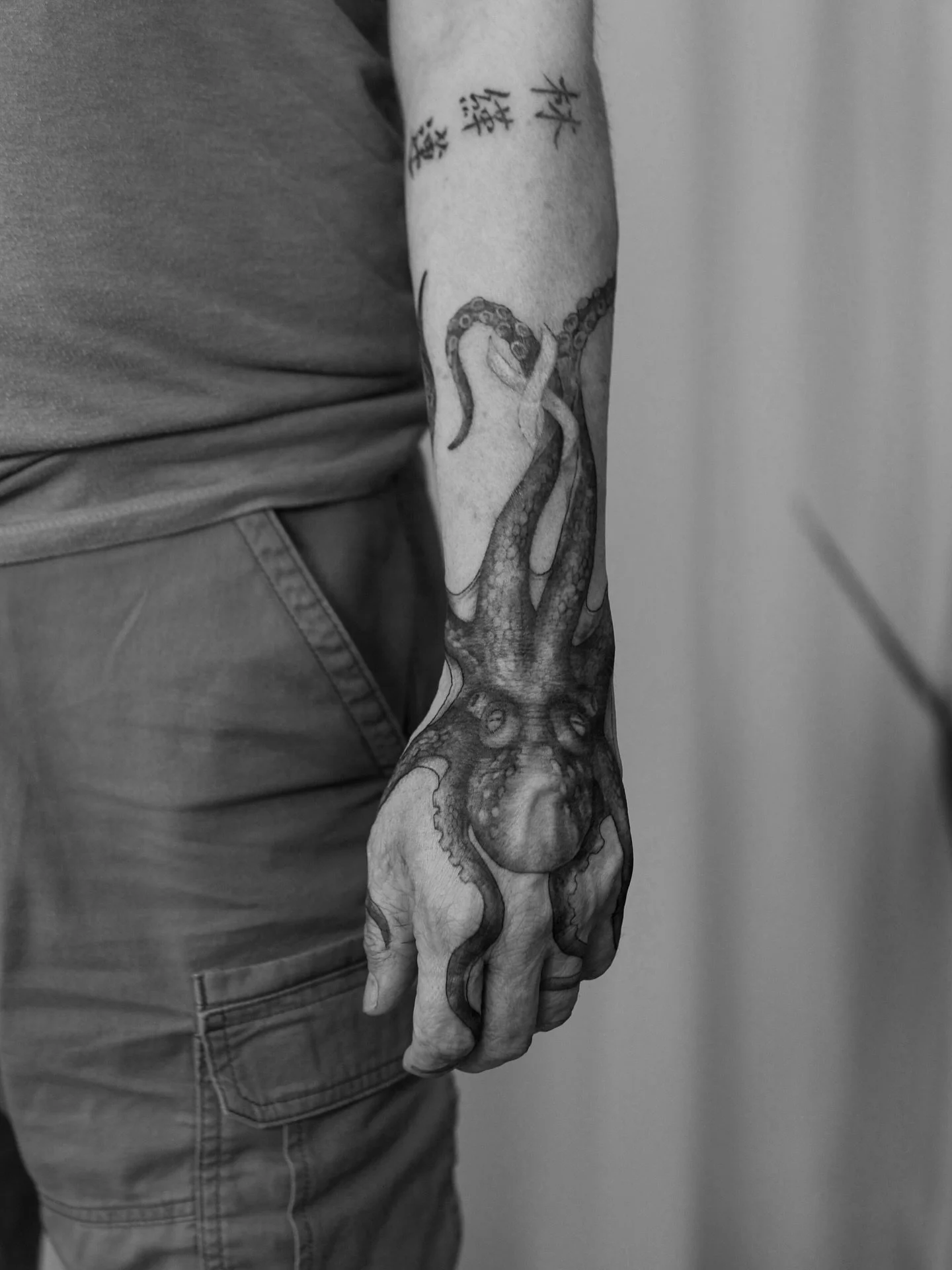 A high honor to be able to commemorate G’s late wife Kel with this piece. As she was a master scuba diver, they shared many memories of the ocean and octopi were seen as friends.
